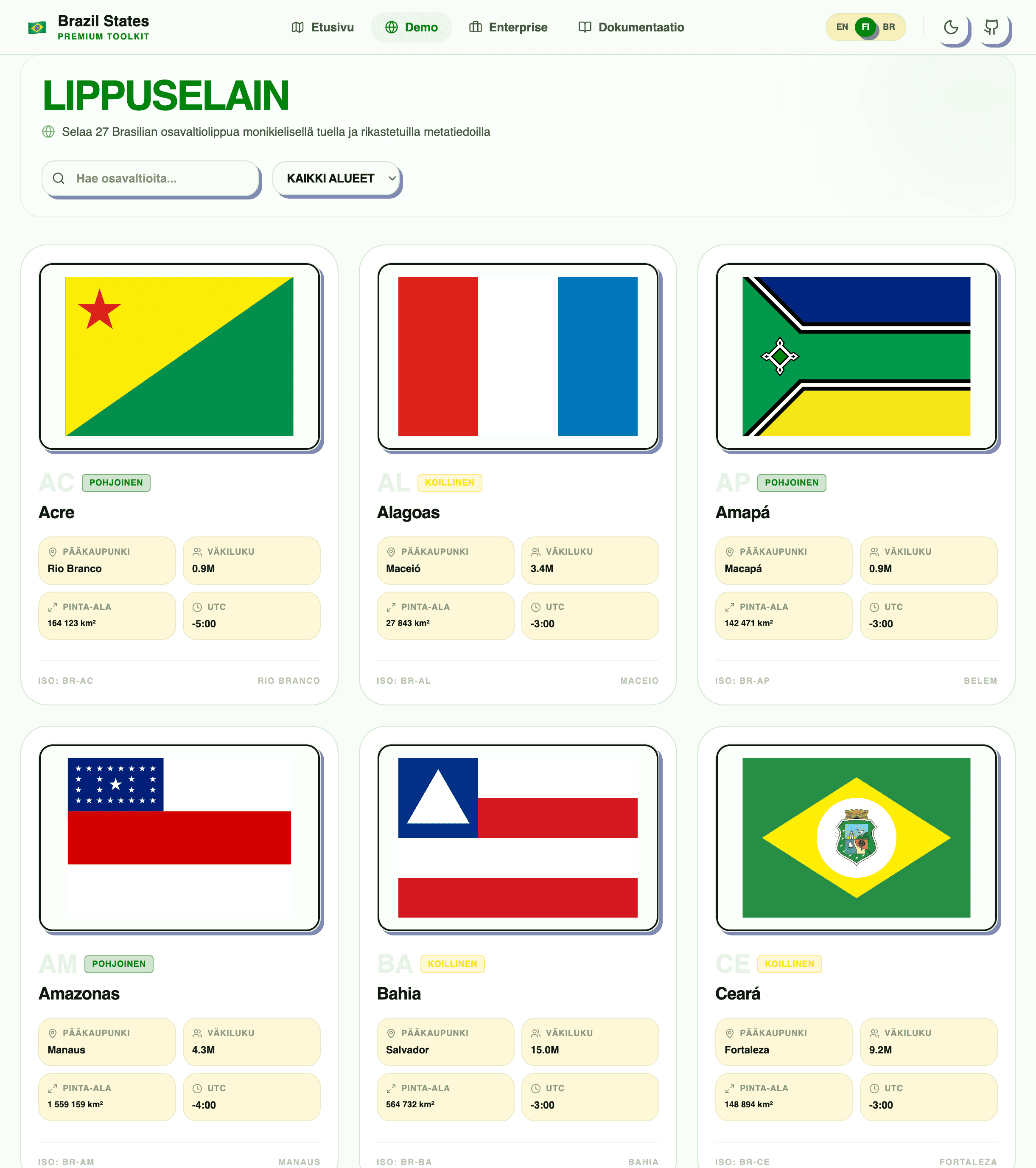 O br-state-flags Demo é uma vitrine web para a biblioteca br-state-flags. Ele permite que os usuários naveguem por todas as 27 bandeiras dos estados brasileiros, inspecionem seus metadados (como capital, população e região) e vejam como elas aparecem em um ambiente de produção.