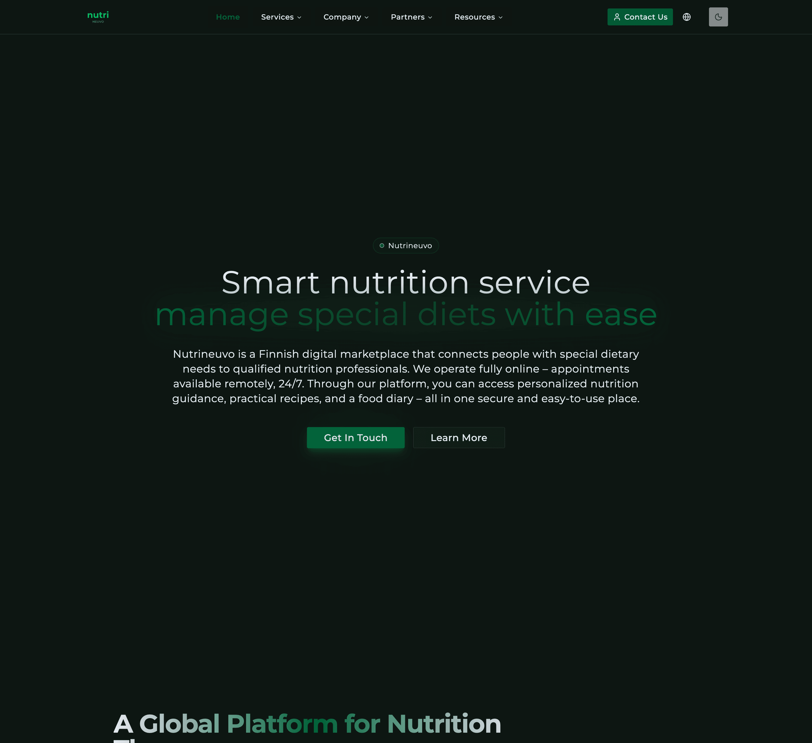 Nutrineuvo é uma plataforma profissional de nutrição e bem-estar com arquitetura moderna de microsserviços, apresentando site de marketing, aplicação frontend e serviços de API separados.